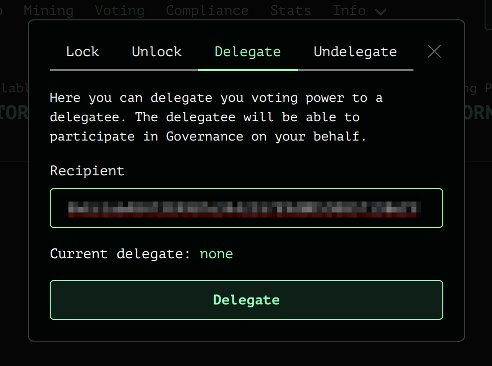 Fill-in the address to which you want to delegate and click Delegate. Approve the transaction in your wallet and wait for confirmation.